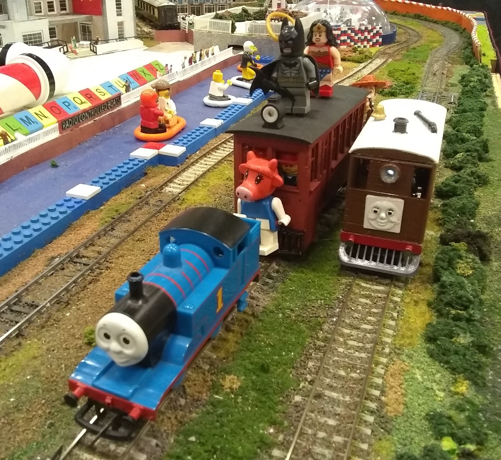 We took the Railcar with Batman & Wonder Woman on the top and Woody riding shotgun on the back together with other locomotives. It was the first outing for “Toby”, the tram engine (from the “Thomas” franchise), that was produced on Mates’ 3D printer over this summer. The show is six hours long and Toby ran alternately with our Batman/Wonder Woman Railcar on one of the tracks say for about half the time. He’s only just about run in now.